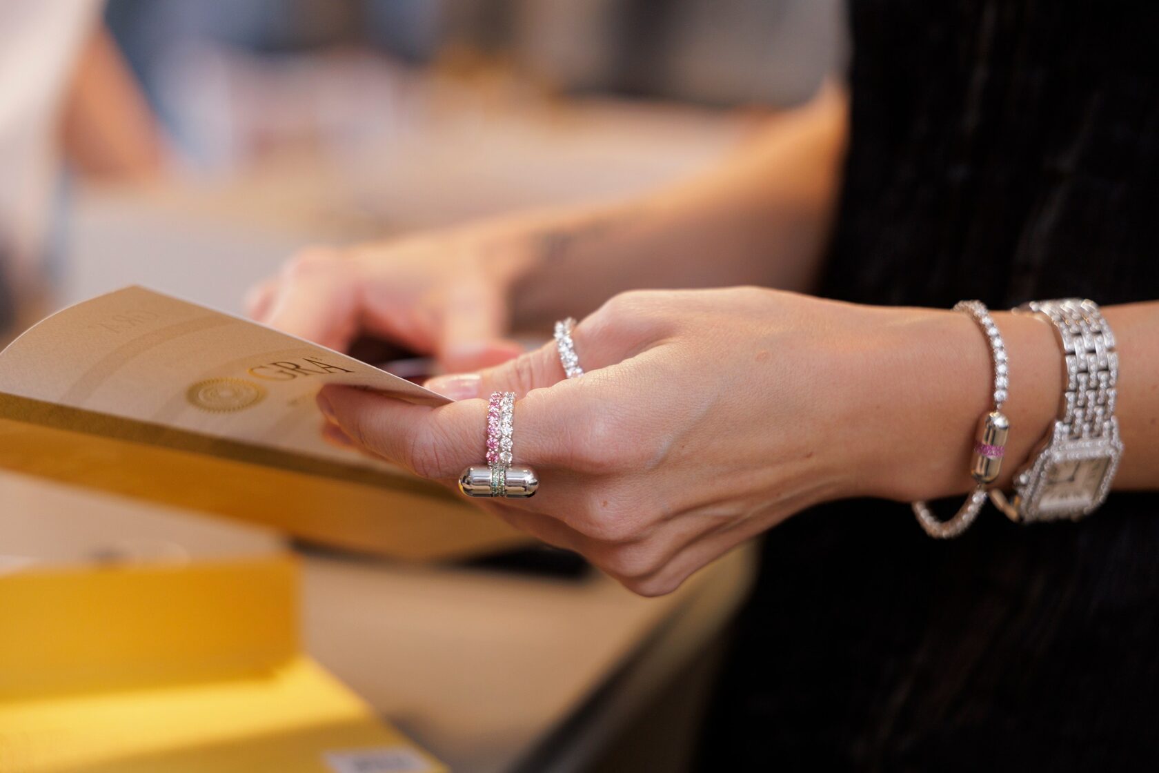 В коллекции представлены кольца («Самоцветы» и «Дорожка») и серьги-гвоздики, выполненные в узнаваемой форме капсулы. Каждое изделие раскручивается, сохраняя интригу взаимодействия, а вставки из лабораторных муассанитов (сертификация GRA) доступны как в классическом белом цвете, так и в цветных вариантах, позволяя владельцу настраивать украшение под личное настроение.